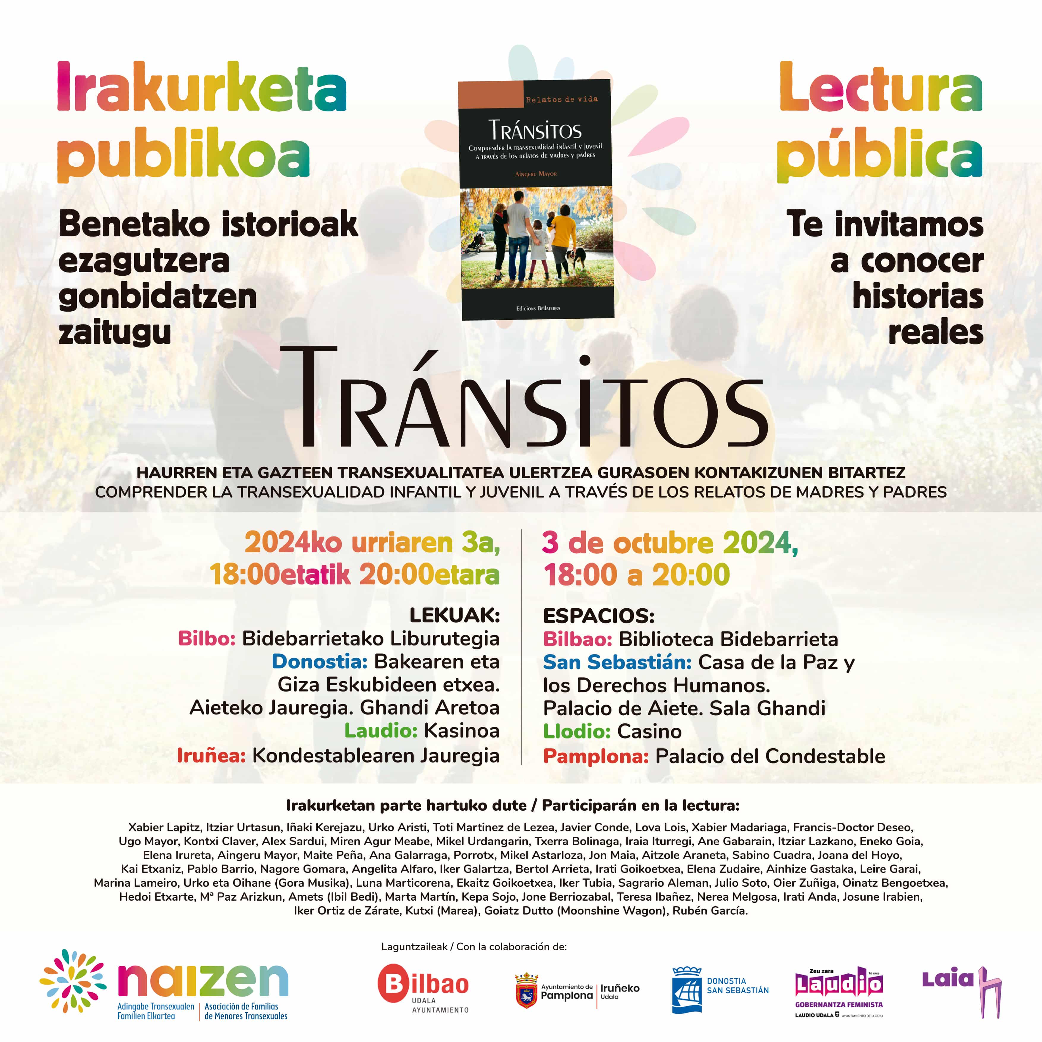 El próximo día 3 de octubre y como parte de la celebración del Octubre Trans desde nuestra asociación Naizen hemos organizado un bonito y valioso acto de lectura pública del libro Tránsitos.