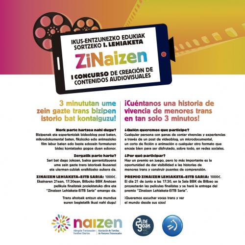 Naizen elkartean ZiNaizeN, Ikus-entzunezko Edukiak Sortzeko I. Lehiaketa antolatu du. 3 minutuan ume zein gazte trans bizipen istorio bat kontaiguzu!