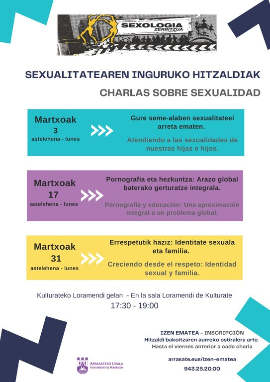 Hitzaldiak 17:30etik 19:00etara izango dira, Kulturateko Loramendi gelan. Eta Arrasateko Udal Sexologia Zerbitzuko sexologoak emango ditu.