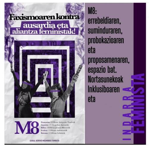 Euskal Herriko Mugimendu Feministak mobilizaziora deitu du martxoaren 8rako, Emakumeen Nazioarteko Egunean, Faxismoaren kontra, ausardia eta aliantza feministak lelopean.