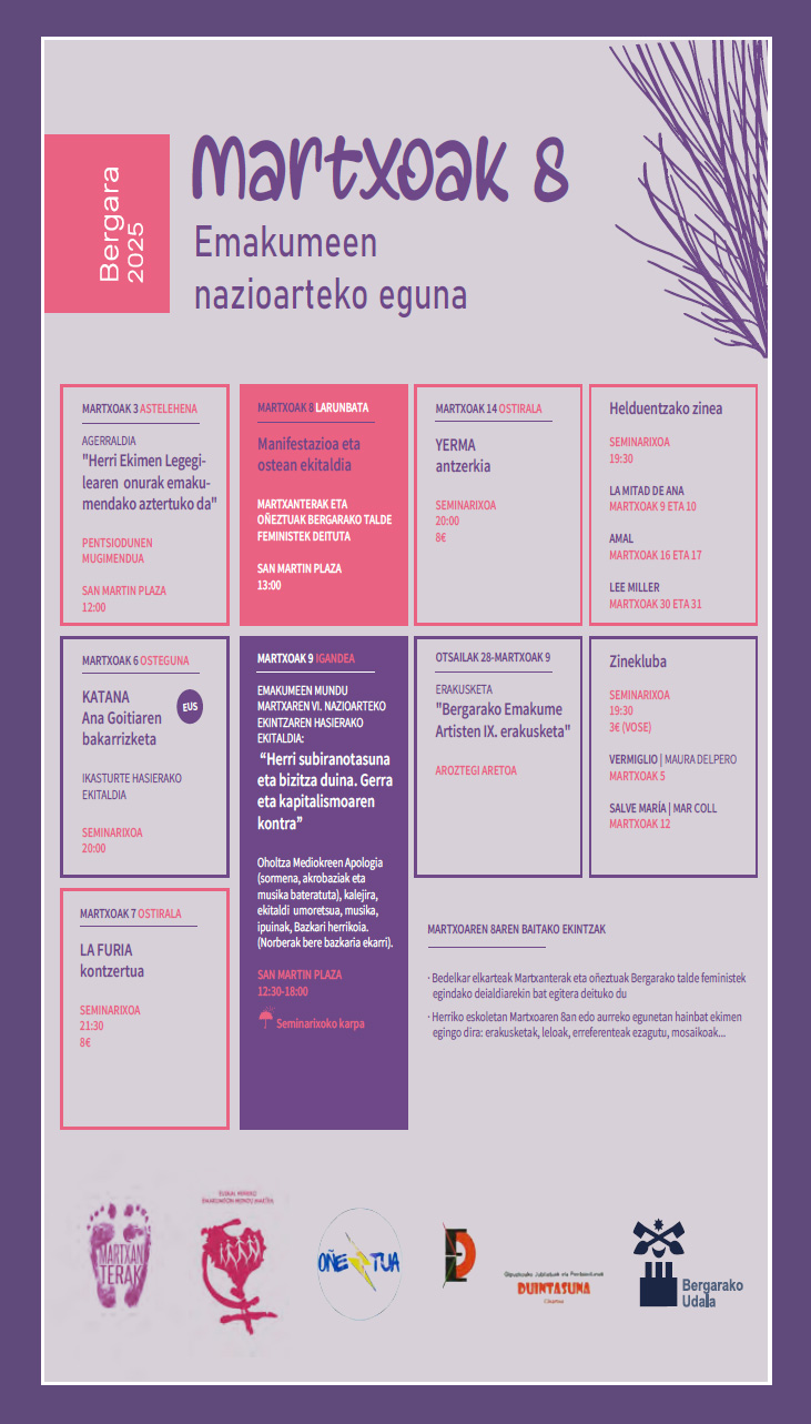 Bergarako Udalak eta herriko elkarte ezberdinek Emakumeen Nazioarteko Eguna ospatzeko prestatu den egitaraua aurkeztu dute. Martxoaren 8aren bueltan, hainbat ekintza antolatu dira, herritarren parte hartzea sustatzeko eta berdintasunaren aldeko aldarria kalera eramateko.
