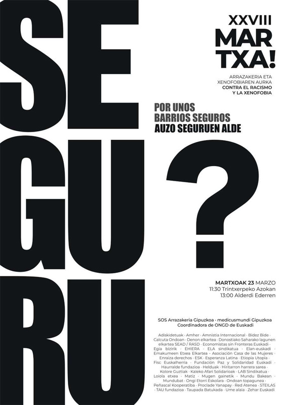 XXVIII. Arrazakeriaren eta Xenofobiaren aurkako Martxan parte hartzera gonbidatzen zaitugu, “SEGURU? Auzo seguruen alde” lelopean, instituzioei baliabideak eskatzeko, auzo seguruak erreklamatzeko, kalean bizi direnak babesteko, azken finean, bertan bizi garen pertsona guztien eskubideak erreklamatzeko.