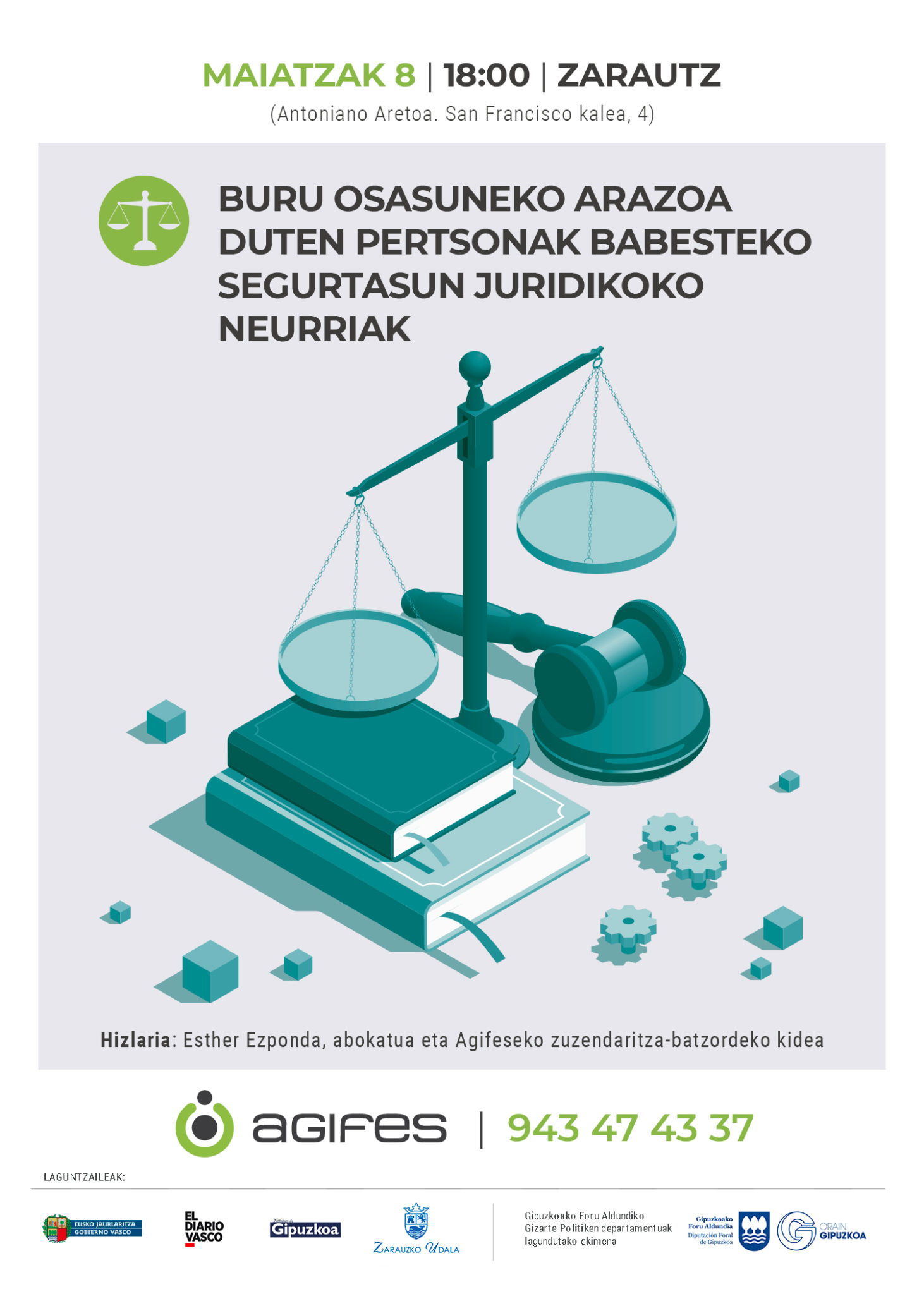 Agifesek hitzaldi bat antolatu du, buru osasuneko arazoak dituzten pertsonen babes juridikorako zer neurri har daitezkeen azaltzeko. Esther Ezponda abokatu eta Agifeseko zuzendaritza-batzordeko kideak emango du hitzaldia, maiatzaren 8an, Zarauzko San Antoniano Aretoan, 18:00etan.