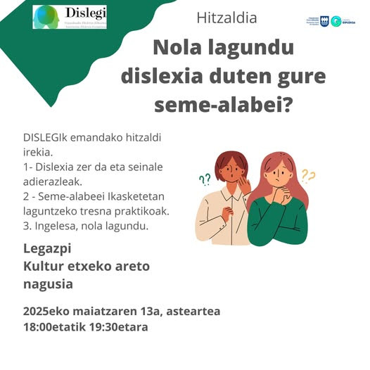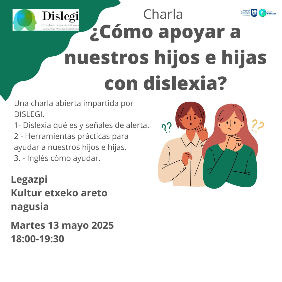 La Asociación Dislegi junto con madres y padres legazpiarras de la asociación ha organizado la charla "¿Cómo apoyar a nuestros hijos e hijas con dislexia?".