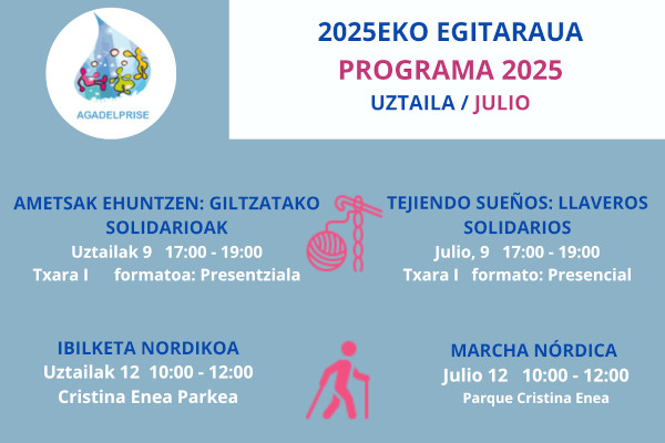 Agadelprise elkarteak uztailerako antolatu dituen ekitaldien egitaraua.