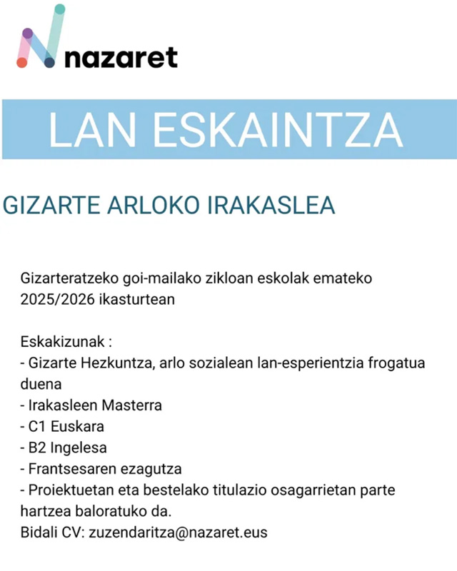 Gizarteratzeko goi-mailako zikloan 2025/2026 ikasturtean eskolak emateko Gizarte arloko irakasle baten bila gabiltza.