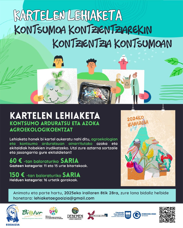 Egoaizia elkarteak Kontsumo Arduratsua eta Azoka Agroekologikoentzako kartelen lehiaketa martxan jarri du. Bi kartel aukeratuko ditugu, gure azoka eta ekitaldi agroekologiko eta kontsumo arduratsuen isla onena izango direnak.