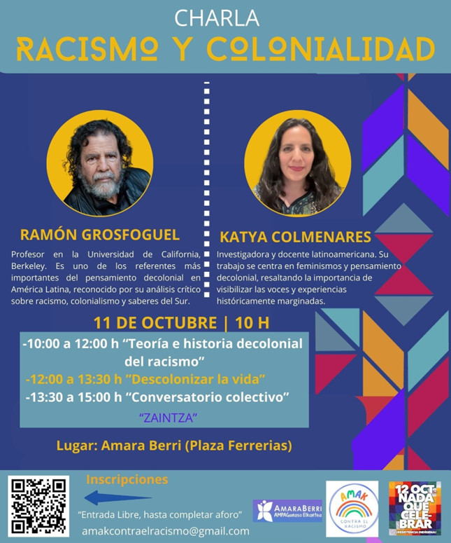 Amak Contra el Racismo taldeak atsegin handiz gonbidatzen gaitu Ramon Grosfoguel eta Katya Colmenares irakasleek “Arrazakeria eta Kolonialtasuna”, arrazakeriari eta dekolonialitateari buruz emango duten gogoeta jardunaldira.