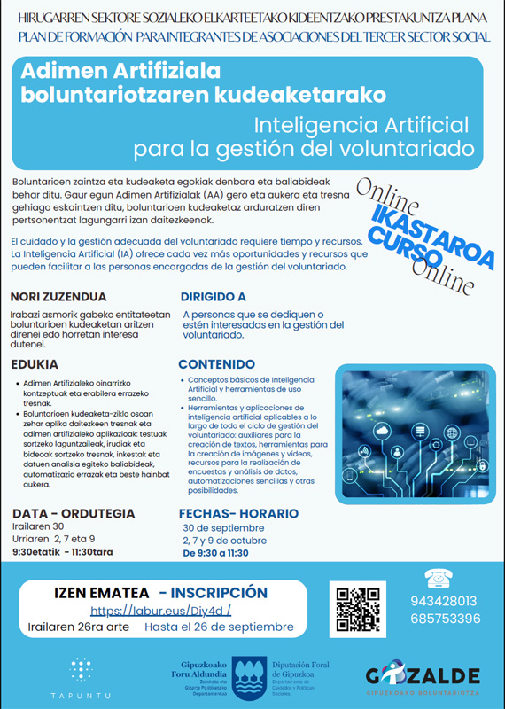 III. sektore sozialeko elkarteetako kideentzako prestakuntza planaren barruan, Gizaldek "Adimen Artifiziala boluntariotzaren kudeaketarako" online ikastaroa antolatu du.