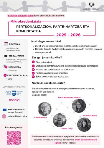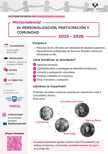 UPV/EHUk unibertsitateko mikrokredentzial bat abiarazi du, hain zuzen ere zainketen pertsonalizazioari, inklusio komunitarioari eta herritartasunaren ariketa osoari buruzko ikuspegi integral bat jorratzen duena. Giza Eskubideen printzipioetan oinarrituta, programa honek ezagutzak eta tresnak ematen ditu laguntza eta zaintza ereduak diseinatzeko eta inplementatzeko, autodeterminazioa, parte-hartze soziala eta eguneroko laguntza beharrak dituzten pertsonen ongizatea sustatzeko.