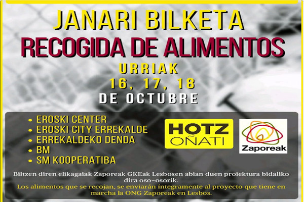 Urriaren 16, 17 eta 18an, ZAPOREAKekin elkarlanean, Hotz Oñatik JANARI BILKETA egingo du herriko supermerkatuetan. Helburua: ZAPOREAK taldeak Lesbosen dauden errefuxiatuei egunero eskaintzen dizkien otorduak prestatzeko janaria biltzea.