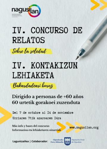 NAGUSILAN, Adinekoen Gizarte Boluntariotza Elkarteak, bakardadeari buruzko IV. Kontakizun Lehiaketa jarri du martxan, idazketa eta irakurketa sustatzeko eta bakardadearen inguruko gogoeta eta sentsibilizazioa bultzatzeko helburuarekin.