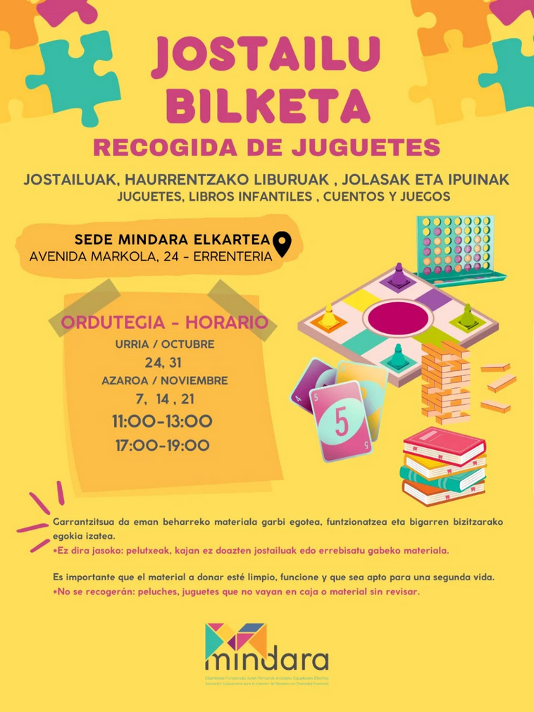 Mindara Elkarteak jostailu, liburu eta jolasen bilketa kanpaina martxan jarri du gure azoka solidariorako. Eman bigarren bizitza bat eta bat egin Mindararekin!