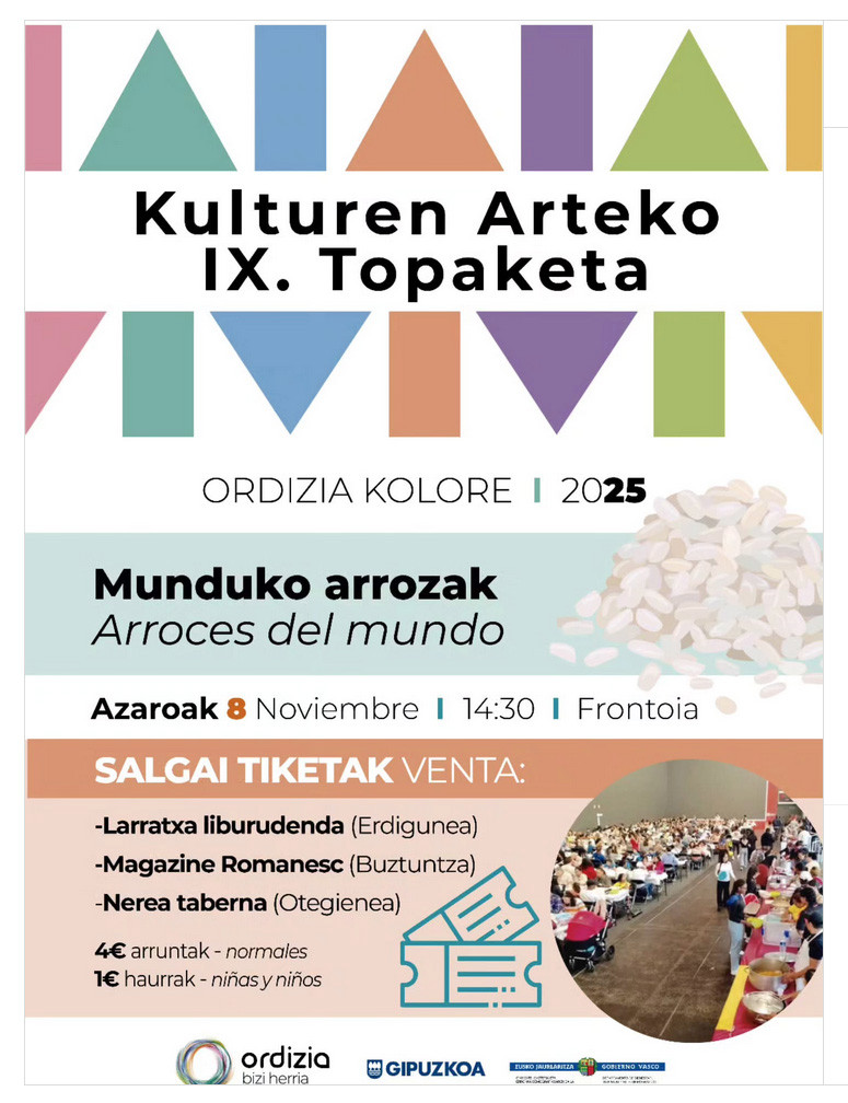 Ordiziako Kulturen Arteko IX. Topaketaren barnean Munduko arrozak bazkari herrikoia azaroaren 8an ospatuko da, Beti Alai pilotalekuan.