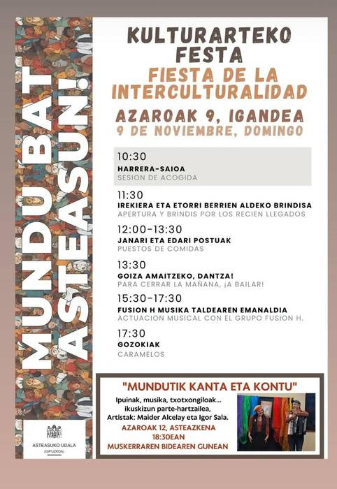 Asteasun, kulturen arteko aniztasuna ospatuko da, azaroaren 9an, igandean, giro atsegin eta parte-hartzailean. Gonbidatuta zaude elkar ezagutzera, partekatzera eta gozatzera!