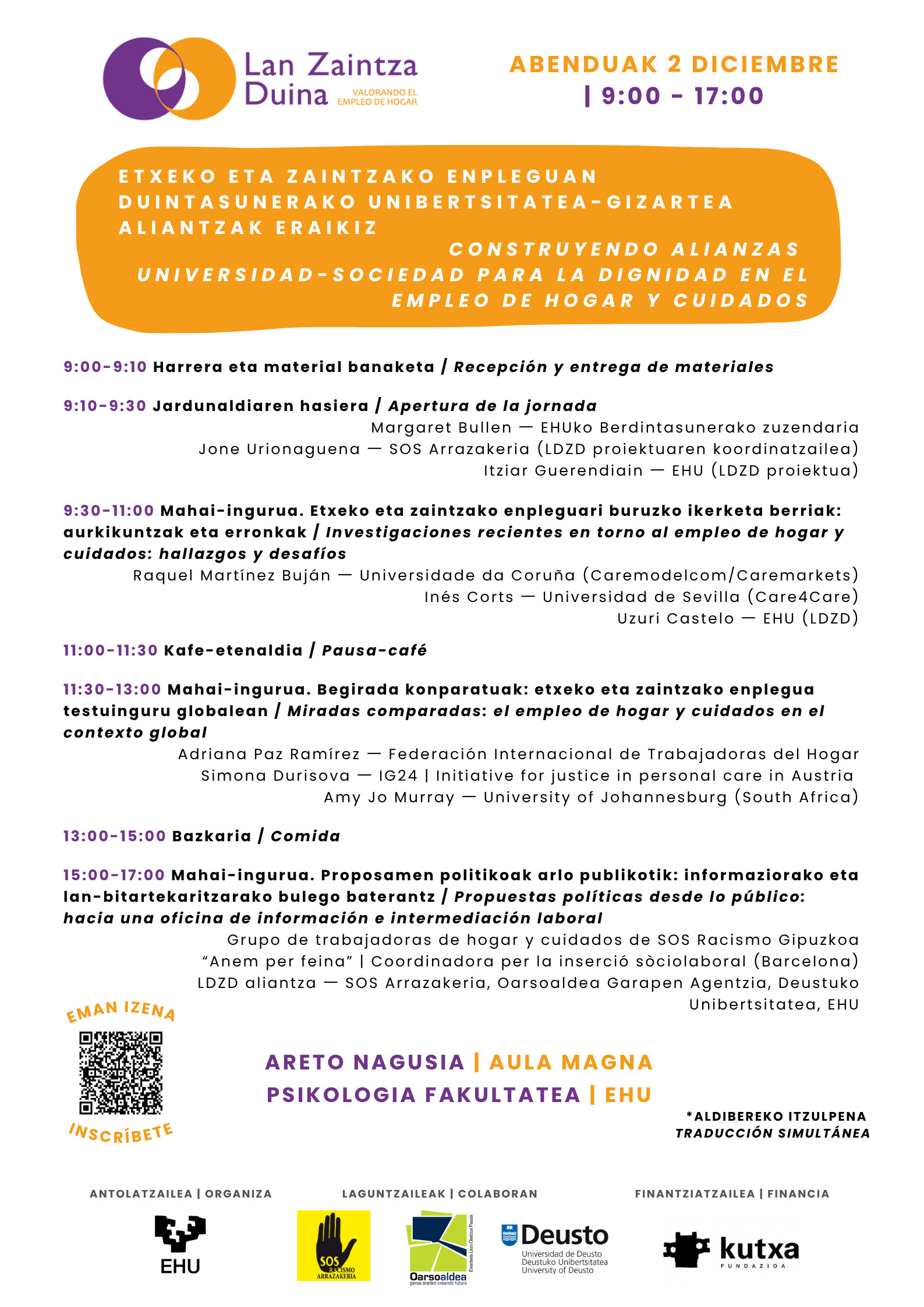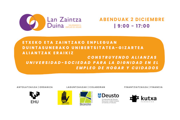 Abenduaren 2an, "Lan Duina, Zaintza Duina" egitasmoaren atzean dagoen ikuspegia eta zergatia partekatuko ditugu, SOS Arrazakeria Gipuzkoa, Deusto Unibertsitatea eta Euskal Herriko Unibertsitatearekin elkarlanean.