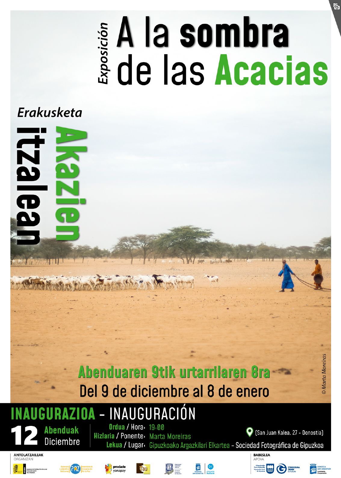 Gipuzkoako Afrika Beharrezkoa ekimenak, Proclade Yanapay, BLB Euskadi, Tau Fundazioa eta Gipuzkoako Argazkilari Elkartearekin elkarlanean, “Akazien itzalian” argazki erakusketa aurkezten du. Marta Moreiras argazkilariaren begiradaren bidez Afrikako errealitate garaikideei buruzko hausnarketa egitera gonbidatzen duen ibilbide bisuala.