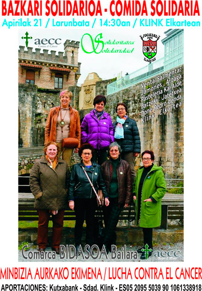 El próximo sábado dia 21, celebraremos en la Sociedad Klink una Comida Solidaria para ayudar a la Lucha contra el Cáncer. Tendremos como invitados a la Junta Directiva de la COMARCA DEL BIDASOA.