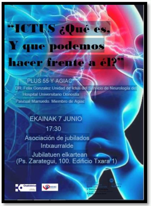 El próximo día 7 de junio, a las 17:30 h, en el local de la Asociación de Intxaurralde, situado en el edificio TXARA I, realizaremos una charla-tertulia "El ICTUS - ¿Qué es y qué podemos hacer frente a él?" y compartiremos nuestro conocimiento con vuestra realidad, que es la de muchas personas.