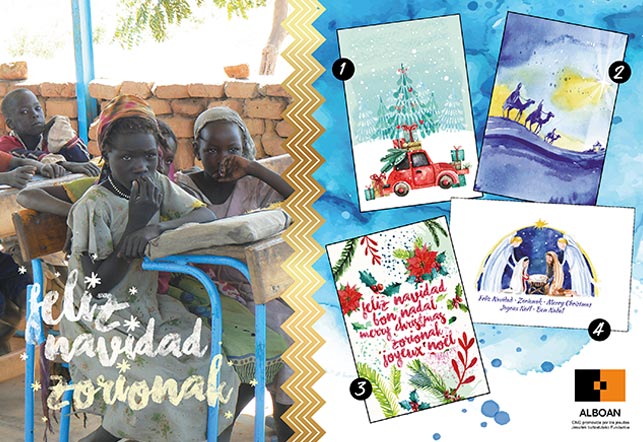 Si vives en la Comunidad Autómoma del País Vasco o en Navarra, y quieres felicitar la Navidad a tus familiares, amigos y amigas con una postal de ALBOAN, tenemos lotes de 4 postales por 5,00 euros disponibles sólo en nuestra sede de Bilbao, Pamplona-Iruñea, San Sebastián-Donostia y Vitoria-Gasteiz.