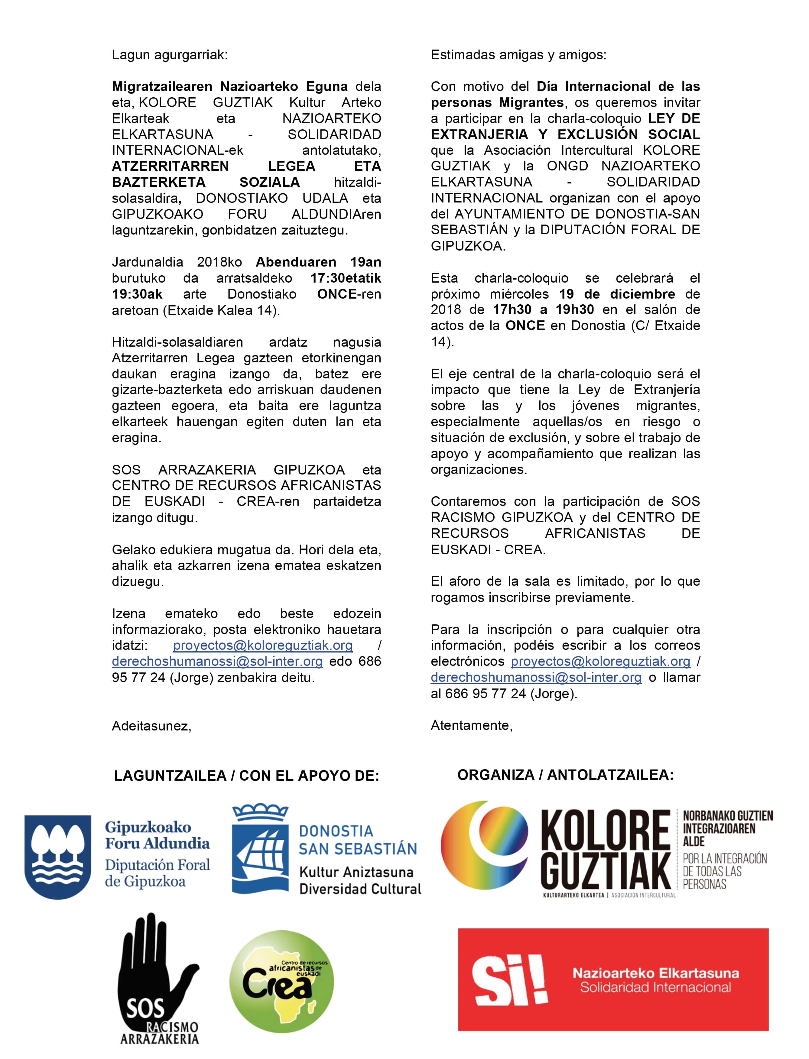 Con motivo del Día Internacional de las personas Migrantes, os queremos invitar a participar en la charla-coloquio LEY DE EXTRANJERIA Y EXCLUSIÓN SOCIAL que la ONGD NAZIOARTEKO ELKARTASUNA - SOLIDARIDAD INTERNACIONAL y la Asociación Intercultural KOLORE GUZTIAK organizan con el apoyo del AYUNTAMIENTO DE DONOSTIA-SAN SEBASTIÁN y la DIPUTACIÓN FORAL DE GIPUZKOA.