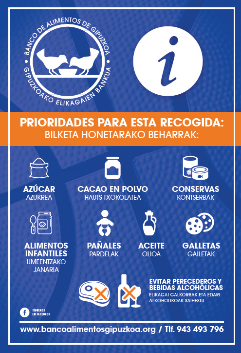 Premia biziko elikagaiak biltzen ditugu, eta Gipuzkoako Elikagaien Bankuari emango dizkiogu.