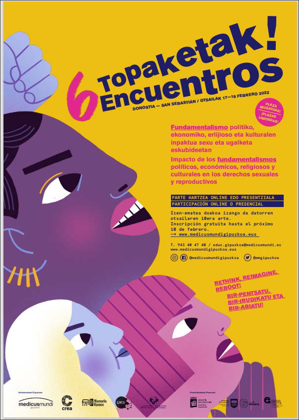 Medicusmundi Gipuzkoak fundamentalismo anitzek sexu eta ugalketa eskubideetan duten inpaktuaren inguruan antolatu dituen VI. Topaketak datorren otsailaren 17an eta 18an burutuko dira, Donostiako UPV/EHUko Fakultatean (UPV/EHUko Psikologia Fakultateko eta Hezkuntza, Filosofia eta Antropologia Fakultateko Areto Nagusia).