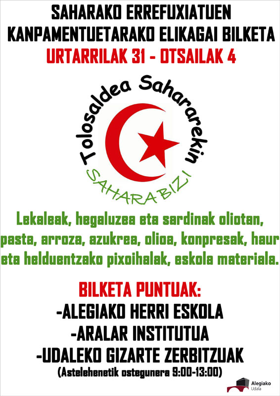 Saharako errefuxiatuen kanpamentuetarako elikagai bilketa egingo da urtarrilaren 31tik otsailaren 4ra bitartean Alegian - Alegiako Herri Eskolan, Aralar institutuan eta Udaleko gizarte zerbitzuetan utzi ahal izango dira produktuak