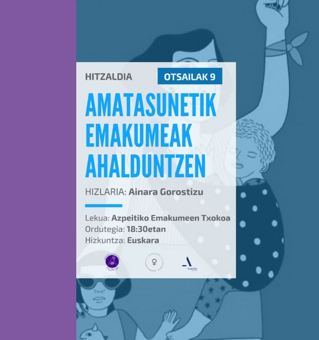 Amatasunarena, oso gutxi landutako gaia da. Baina urtez urte, emakumeak jendartean zapalduak mantentzeko baliagarriak izan diren amatasun ereduak sustatu direla kontziente gara. Horregatik, eredu ahalduntzaileen inguruan hitz egiteko, hausnartzeko eta amatasun bizigarriagoa egiteko estrategiak izango ditugu hizpide, hitzaldi honetan.