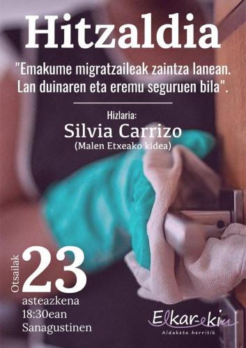 Elkar-ekin elkartearen eskutik Silvia Carrizok emakumen migratzaileen lan baldintzen inguruko hitzaildia eskainiko du.