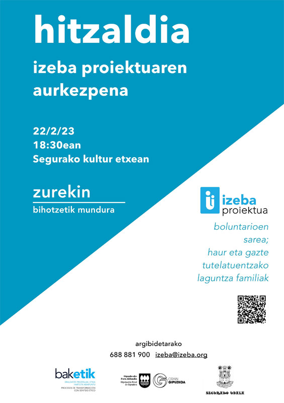 Se necesitan en Segura y alrededores personas y/o familias voluntarias para el Proyecto Izeba. Por ello, en colaboración con el Ayuntamiento de Segura, hemos organizado una reunión informativa para dar a conocer esta iniciativa; será el 5 de marzo a las 18,30h en la casa de cultura de Segura (bilingüe).