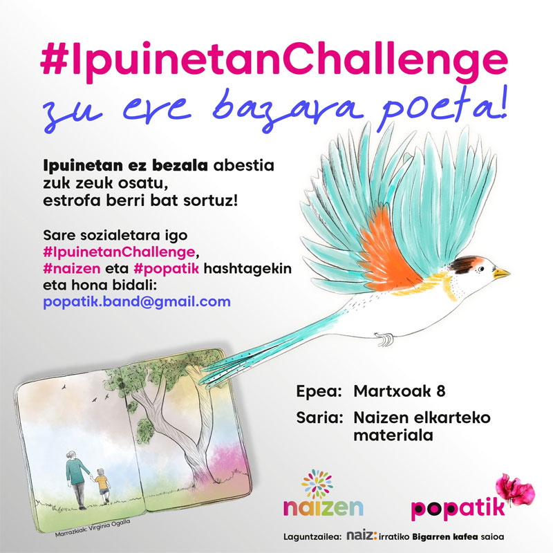 Erronkan parte hartzeko, martxoaren 8a arte zu(e)k sortutako estrofa (idatziz, errezitatuta, kantatuta, musika-tresnaren batez lagunduta...) igo ezazu(e) sare sozialetara (ondoko hashtag-ak gehituz: #ipuinetanchallenge #naizen #popatik).