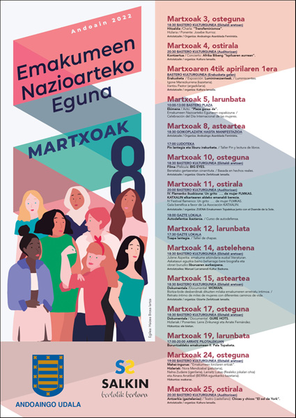 Andoainen martxoaren 8ko Emakumeen Nazioarteko Egunaren aitzakian antolatu diren ekitaldien egitaraua.