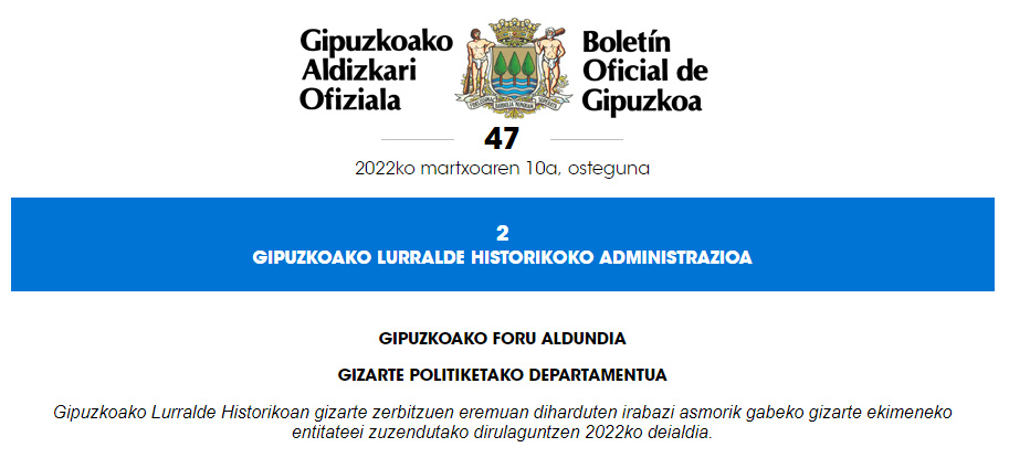 Gipuzkoako Lurralde Historikoan gizarte zerbitzuen eremuan diharduten irabazi asmorik gabeko gizarte ekimeneko entitateei zuzendutako dirulaguntzen 2022ko deialdia, ondorengo lerroentzat: