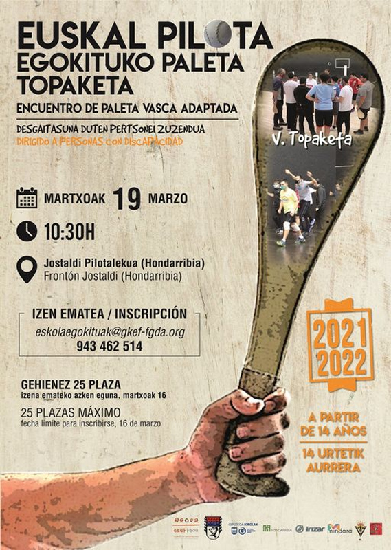 El próximo sábado tendremos el V. ENCUENTRO de paleta vasca adaptada dirigida a personas mayores de 14 años. Te animas?