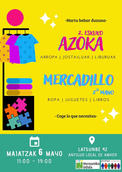 La asociación Amher y el Ayuntamiento de Hernani organizan el Mercadillo de 2ª mano. El mercadillo es totalmente gratuito.