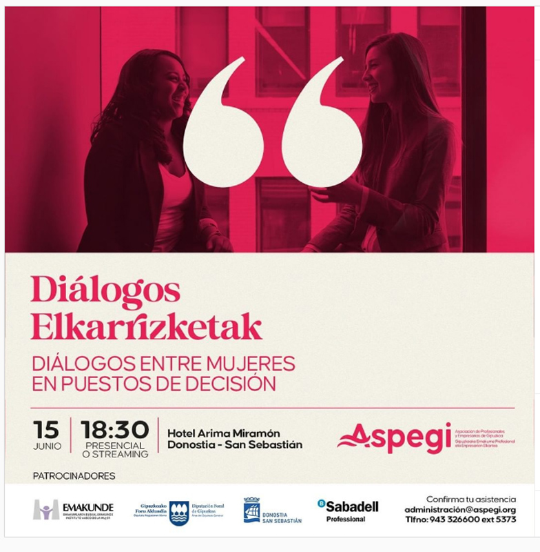 ASPEGI elkartetik "Diálogos entre mujeres en puestos de decisión de las empresas", ASPEGI Elkarrizketak egitarauaren zazpigarren ediziora gonbidatzen zaituztegu.