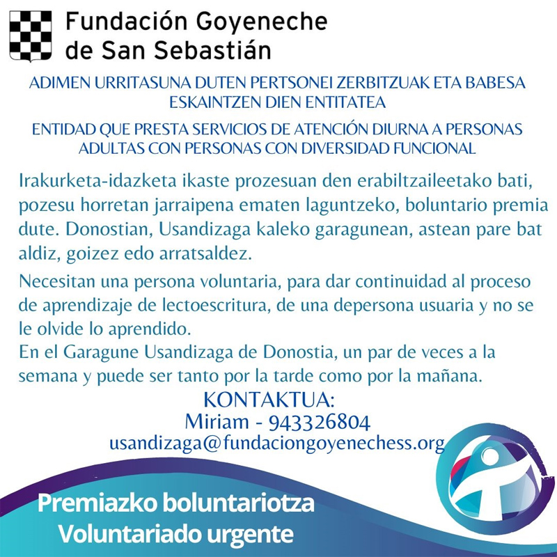 Irakurketa-idazketa ikaste prozesuan den erabiltzaileetako bati, prozesu horretan jarraipena ematen laguntzeko, boluntario premia dute.
