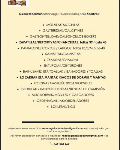 Red Ciudadana de Acogida de Donostia ha puesto en marcha la campaña de recogida de ropa. Necesitamos para hombres.