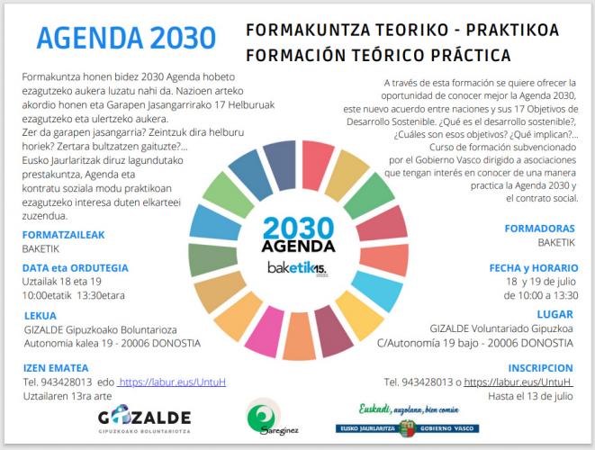 Formakuntza honen bidez 2030 Agenda hobeto ezagutzeko aukera luzatu nahi da. Nazioen arteko akordio honen eta Garapen Jasangarrirako 17 Helburuak ezagutzeko eta ulertzeko aukera. Zer da garapen jasangarria? Zeintzuk dira helburu horiek? Zertara bultzatzen gaituzte?... Eusko Jaurlaritzak diruz lagundutako prestakuntza, Agenda eta kontratu soziala modu praktikoan ezagutzeko interesa duten elkarteei zuzendua.