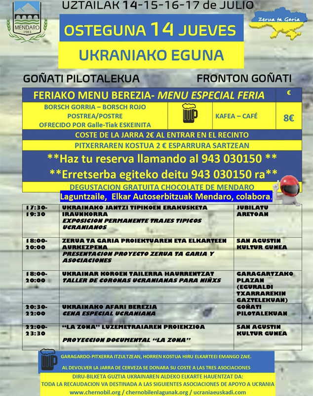 Para concienciar sobre la situación en Ucrania y recaudar la mayor cantidad de dinero posible para las asociaciones que están ayudando a Ucrania, un grupo de ciudadanos ha organizado una feria de cerveza de cuatro días en Mendaro para los días 14, 15, 16 y 17 de julio.