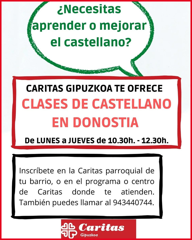 Ikasturtea hastear da, eta horrekin batera, Caritasek pertsonen zenbait beharrei erantzuna emateko eskaintzen dizkien laguntza-jarduerak. Horien artean, helduentzako gaztelaniazko eskolak daude. Jarduera, Caritasko edozein zerbitzuetatik bideratzeko zabalik dago, nahiz eta Donostian eskolak Donostian eman. Hala nola, beste gune batzuetan, helduentzako hezkuntza-zentroetan adibidez, jasotzen duten laguntza osatzen duen jarduera da.