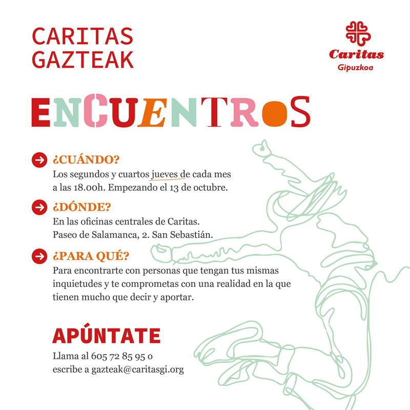 CARITAS GAZTEAK zain dituzu hileko bigarren eta laugarren ostegunetan, 18:00etan, CARITAS GIPUZKOAn (Salamanca pasealekua 2, Donostia). Bertan, beste gazte batzuk ezagutu ahal izango dituzu, eta errealitate sozialarekin konprometitu, egoera hobetzeko.