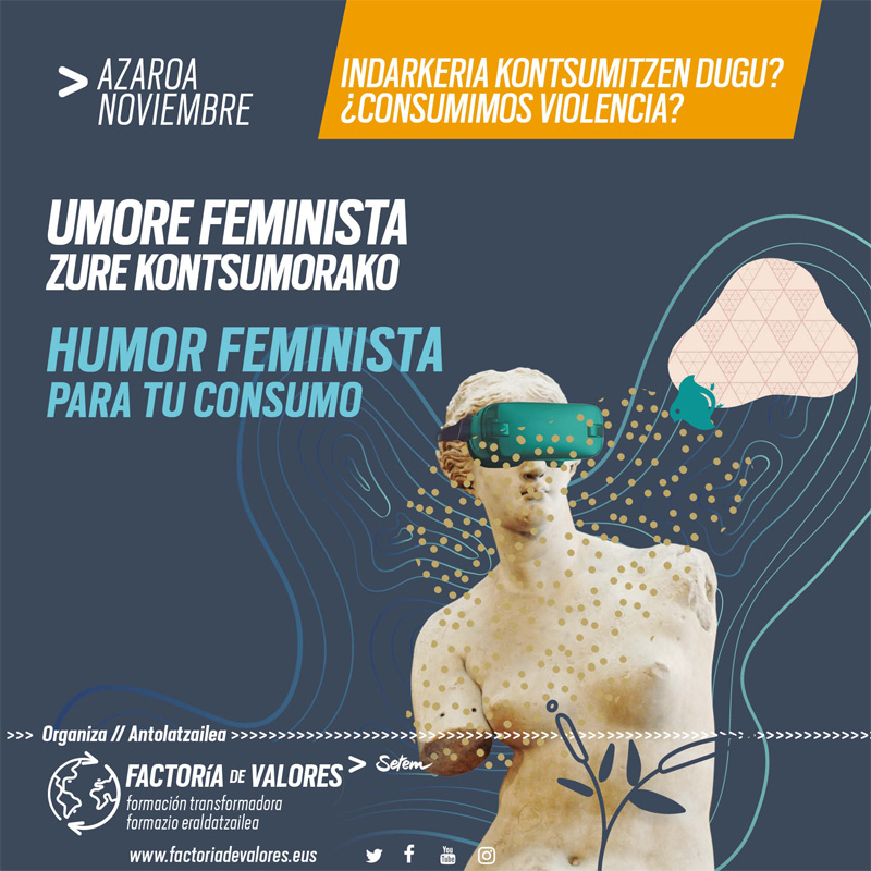 Azaroaren 10etik 13ra “Umore feminista zure kontsumorako” ikuskizuna biran izango dugu Euskadiko lau herritan zehar. Ermuan, Izarran, Basaurin eta Oñatin hiru emakume antzezle eta sortzaileren obrak ikusi ahal izango dira, SETEM Hego Haizearen “Indarkeria kontsumitzen dugu?” azterlanaren emaitzetan oinarritutakoak.