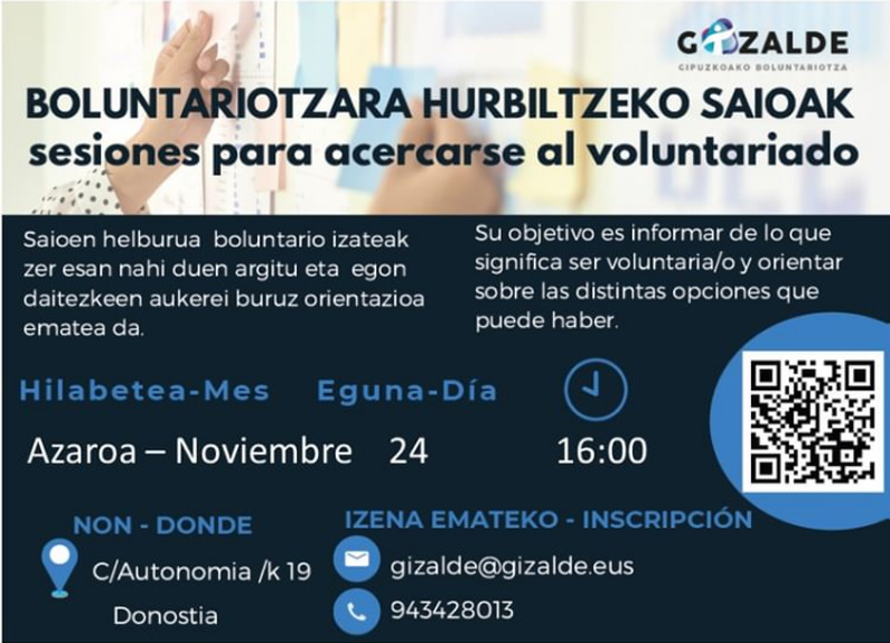 Gure hileroko boluntariotzara hurbiltzeko saioak azaroaren 24ean (16:00etan) izango dira. Boluntario izatea pentsatzen baduzu eta izan ditzakezun zalantzak argitu nahi badituzu.