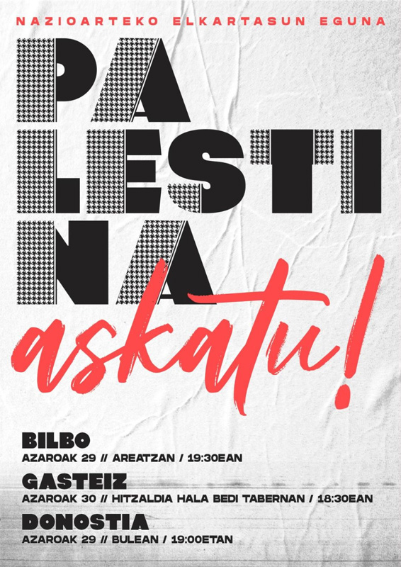El próximo 29 de noviembre, con motivo del Día Internacional de Solidaridad con el Pueblo Palestino, el movimiento de solidaridad con Palestina ha convocado diferentes movilizaciones en capitales de Hego Euskal Herria: