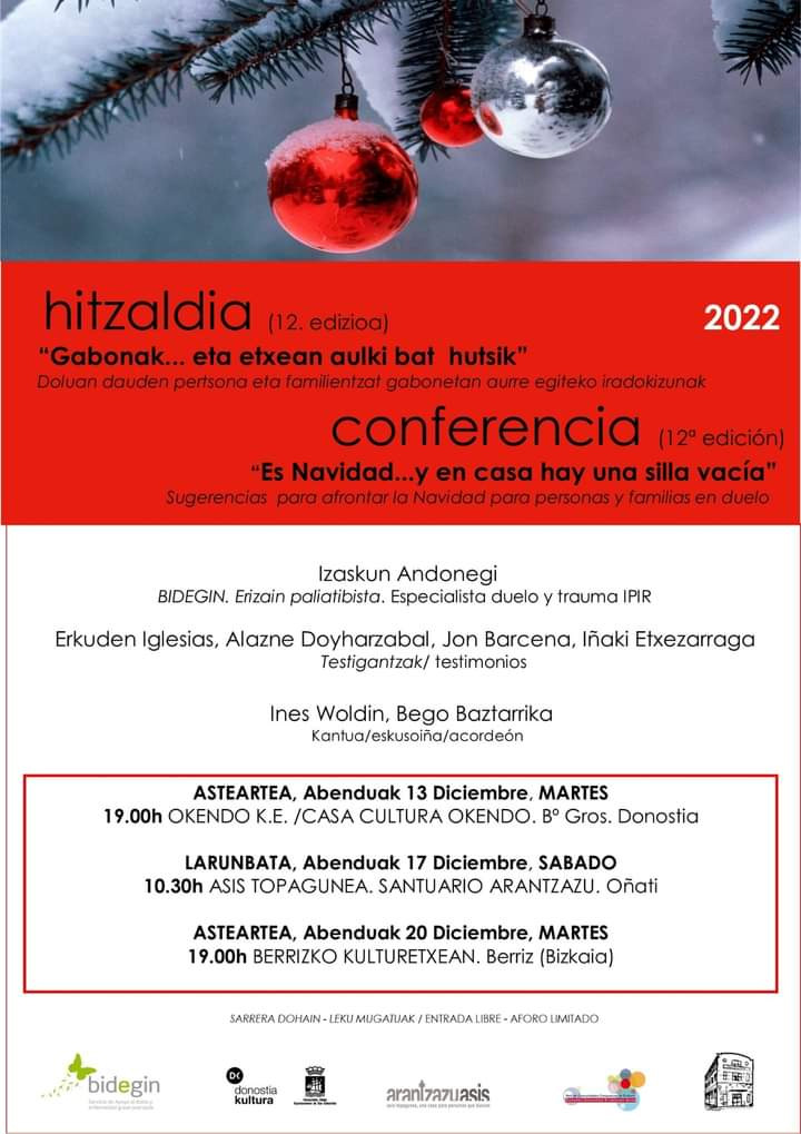 La asociación Bidegin organiza la 12ª edición de las sesiones de conferencias "Es Navidad…y en casa hay una silla vacía". Sugerencias para afrontar la Navidad para personas y familias en duelo.