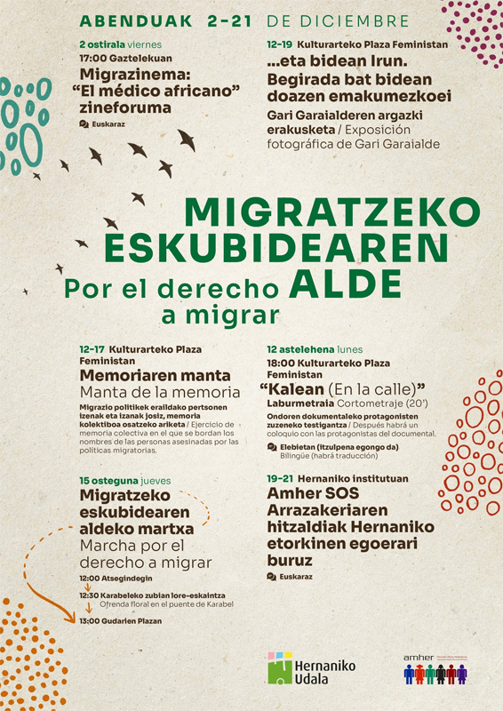 La asociación Amher SOS Racismo y el Ayuntamiento de Hernani han organizado las jorandas "Por el derecho a migrar". Programación para reivindicar el derecho a migrar y para denunciar las vulneraciones de derechos que viven las personas migrantes.