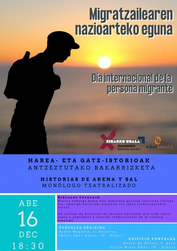 Migratzailearen nazioarteko eguna ospatzeko, Eibarko Udaleko Kultura Aniztasunaren eta Immigrazioaren Unitateak ““Hondarrezko eta gatzezko istorioak" [Historias de arena y sal”] antzeztutako-monologoa antolatu du abenduaren 16an, 18:30ean, Portalean.