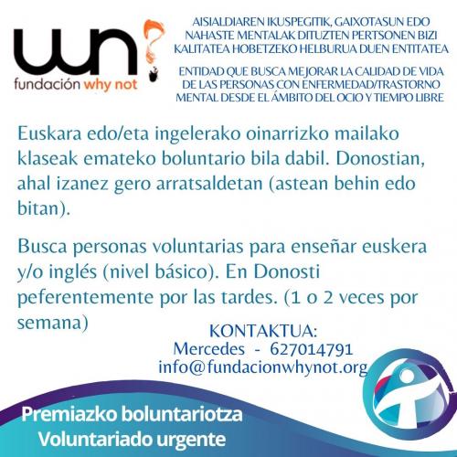 Fundación Why Not elkartea euskera edota ingelerako oinarrizko mailako klaseak emateko boluntario bila dabil.